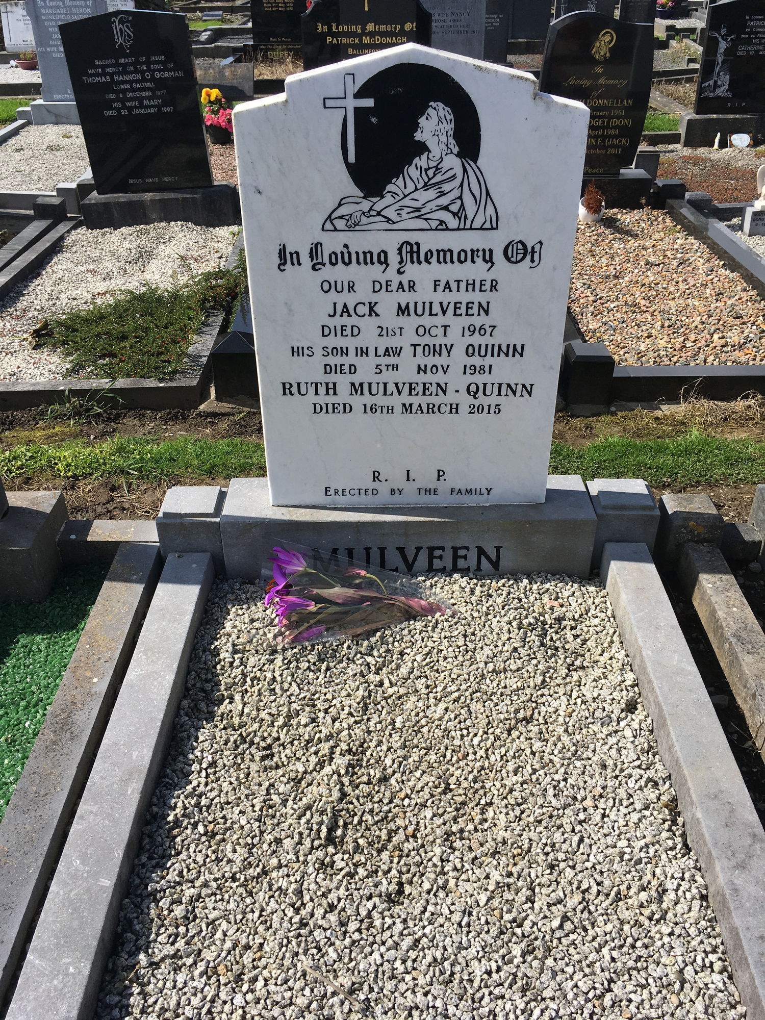 In loving memory of our dear father, Jack Mulveen, died 21 Oct 1967, his son in law Tony Quinn, died 5 Nov 1981, Ruth Mulveen Quinn, died 16 March 2015.