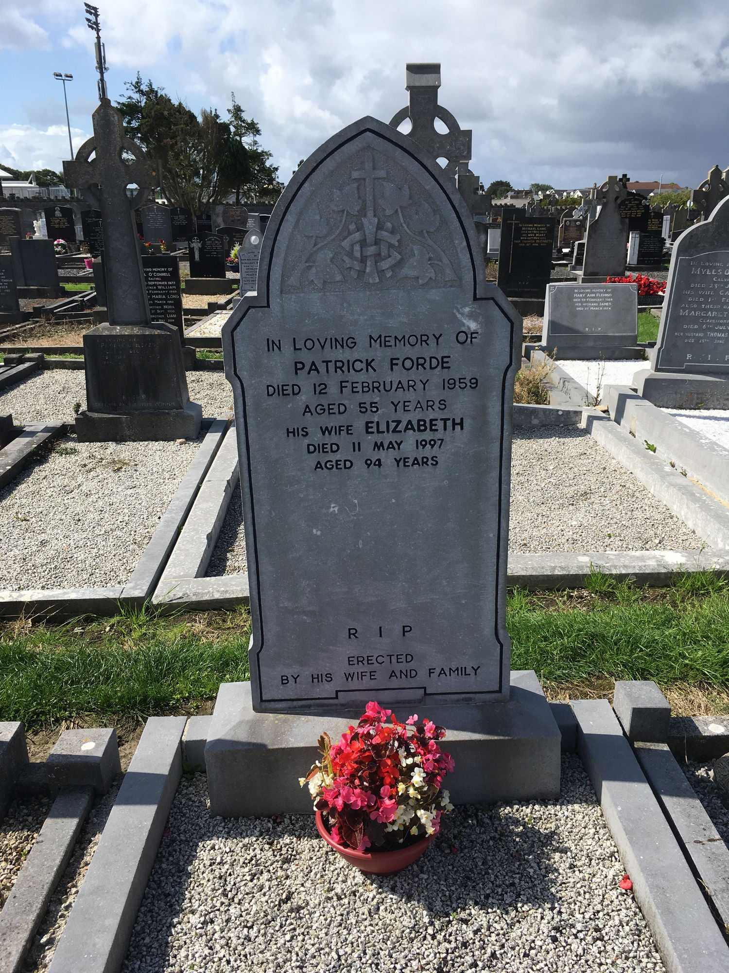 In loving memory of, Patrick Forde, died 12 Feb 1959, aged 55 years, his wife Elizabeth, died 11 May 1997, aged 94 years.