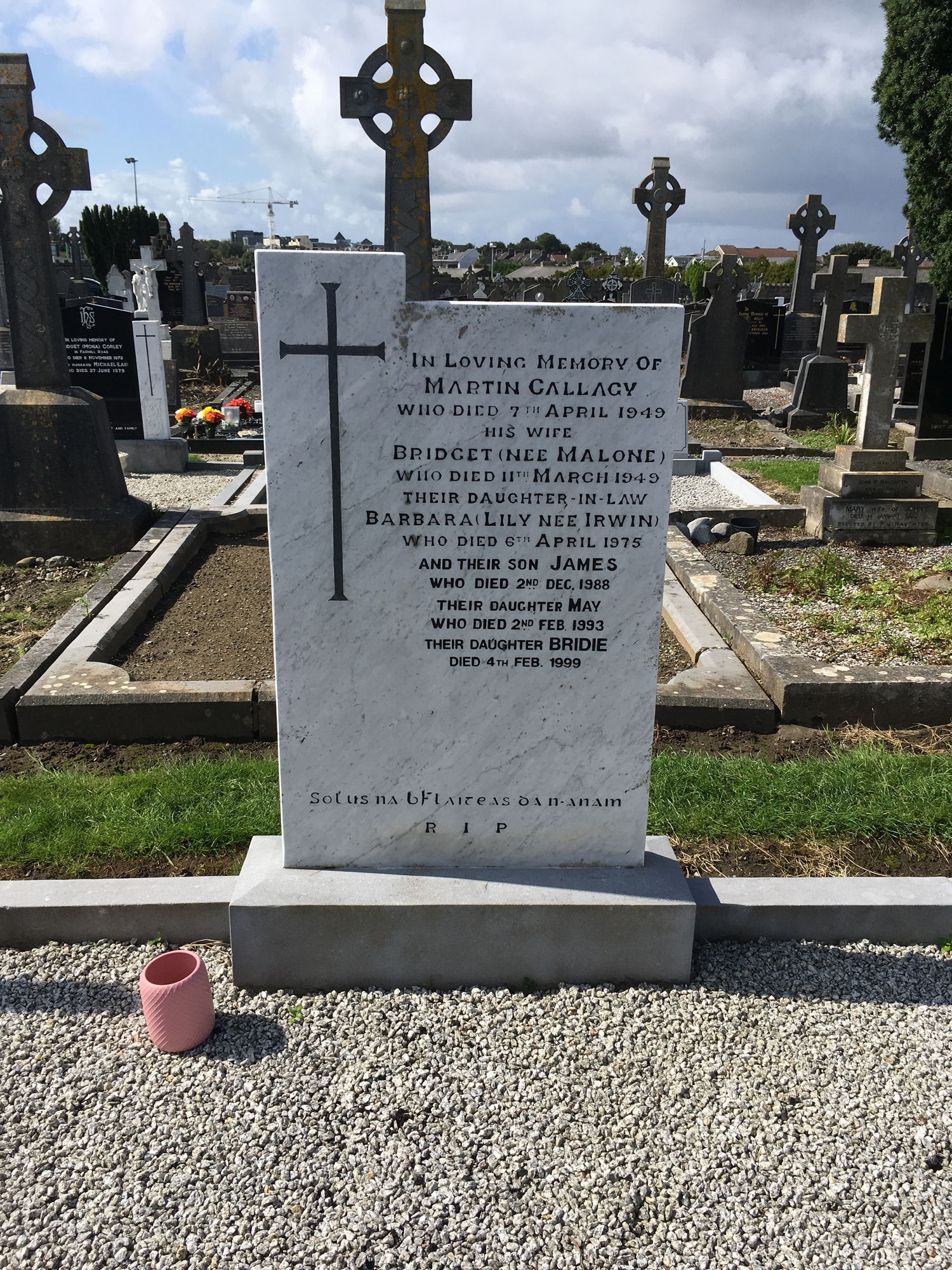 In loving memory of, Martin Callagh, who died 7 April 1949, his wife Bridget nee Malone, who died 11 March 1949, their daughter in law Barbara (Lily nee Irwin), died 6 April 1975, and their son James, died 2 Dec 1988, their daughter May, 2 May 1993, their daughter Bridie, died 4 Feb 1999.