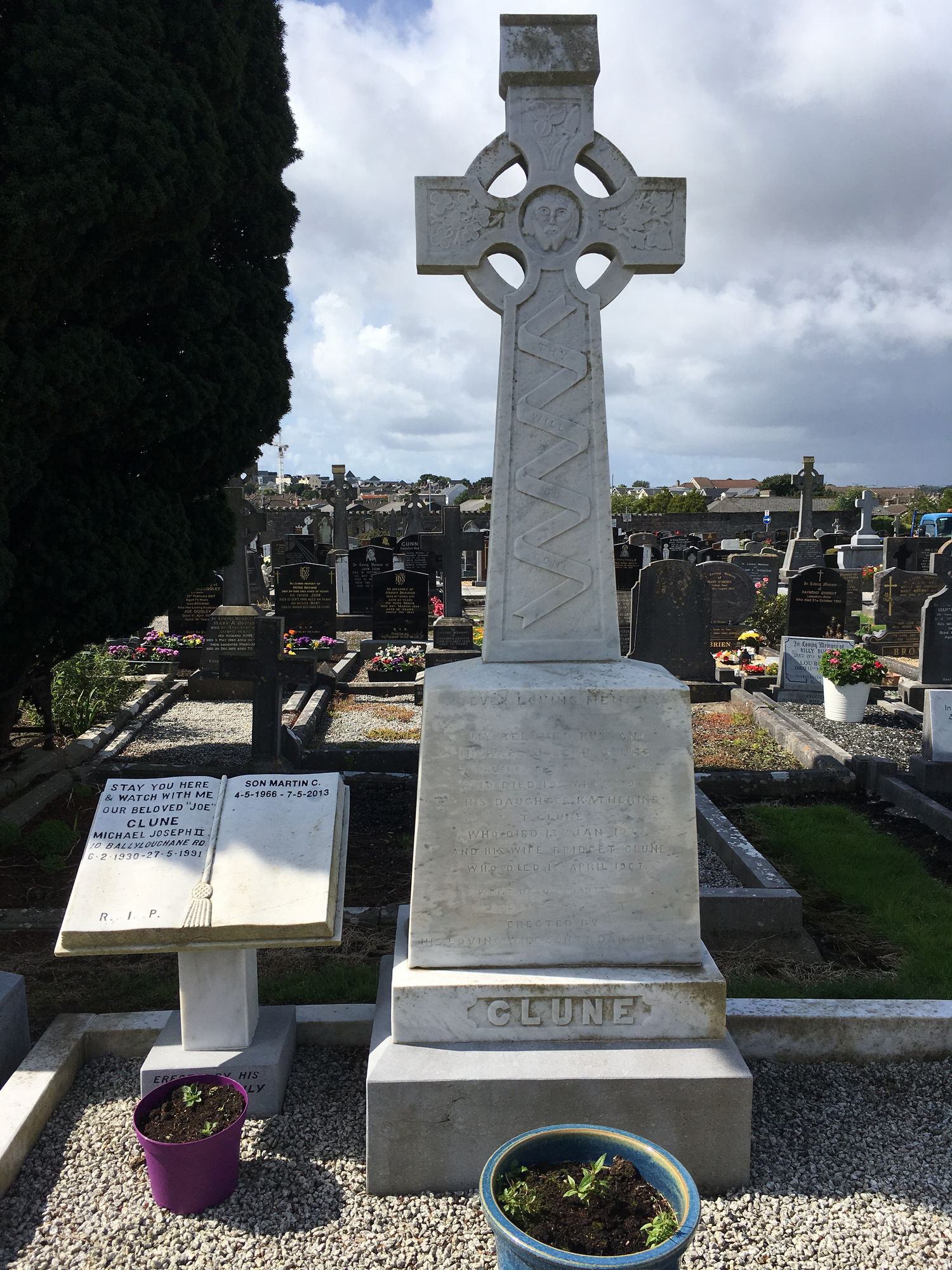 Ever loving memory of, my beloved husband, Michael J Clune, Walshes Tce Galway, who died 19 April 1916, his daughter Katherine T Clune, who died 13 April 1933, and his wife Bridget Clune, died 16 April 1967. Michael Joseph II, 10 Ballyloughane Rd, 6.2.1930 - 27.5.1991, son Martin C, 4.4.1966 - 7.5.2013