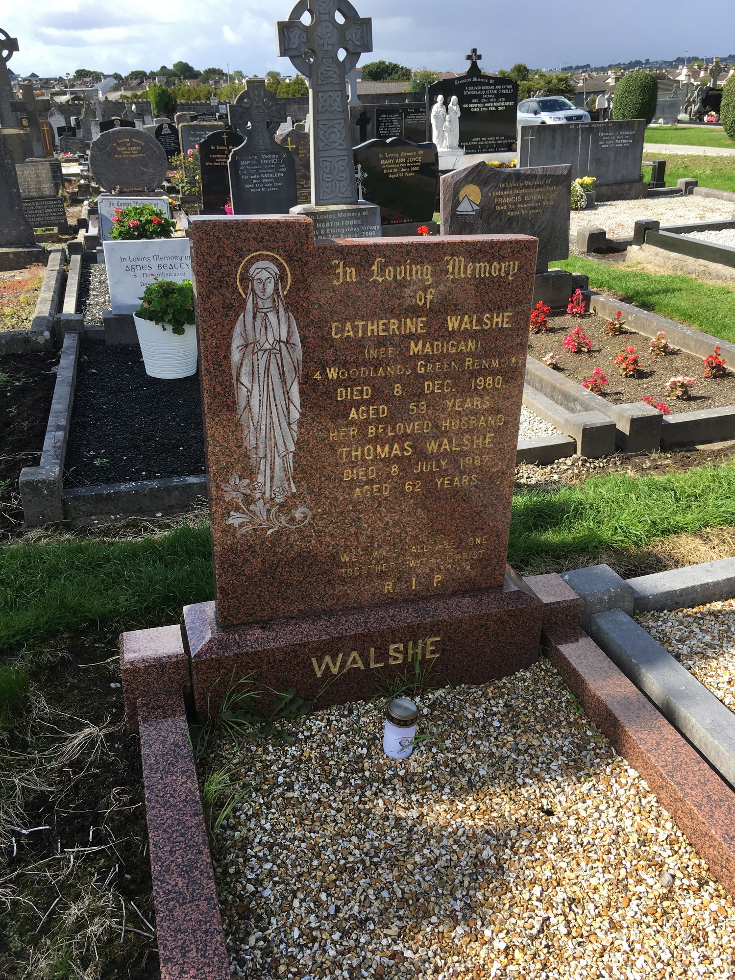In loving memory of Catherine Walshe, nee Madigan, 4 Woodlands Green Renmore, died 8 Dec 1980, aged 59 years, her beloved husband, Thomas Walshe, died 8 July 1987, aged 62 years.