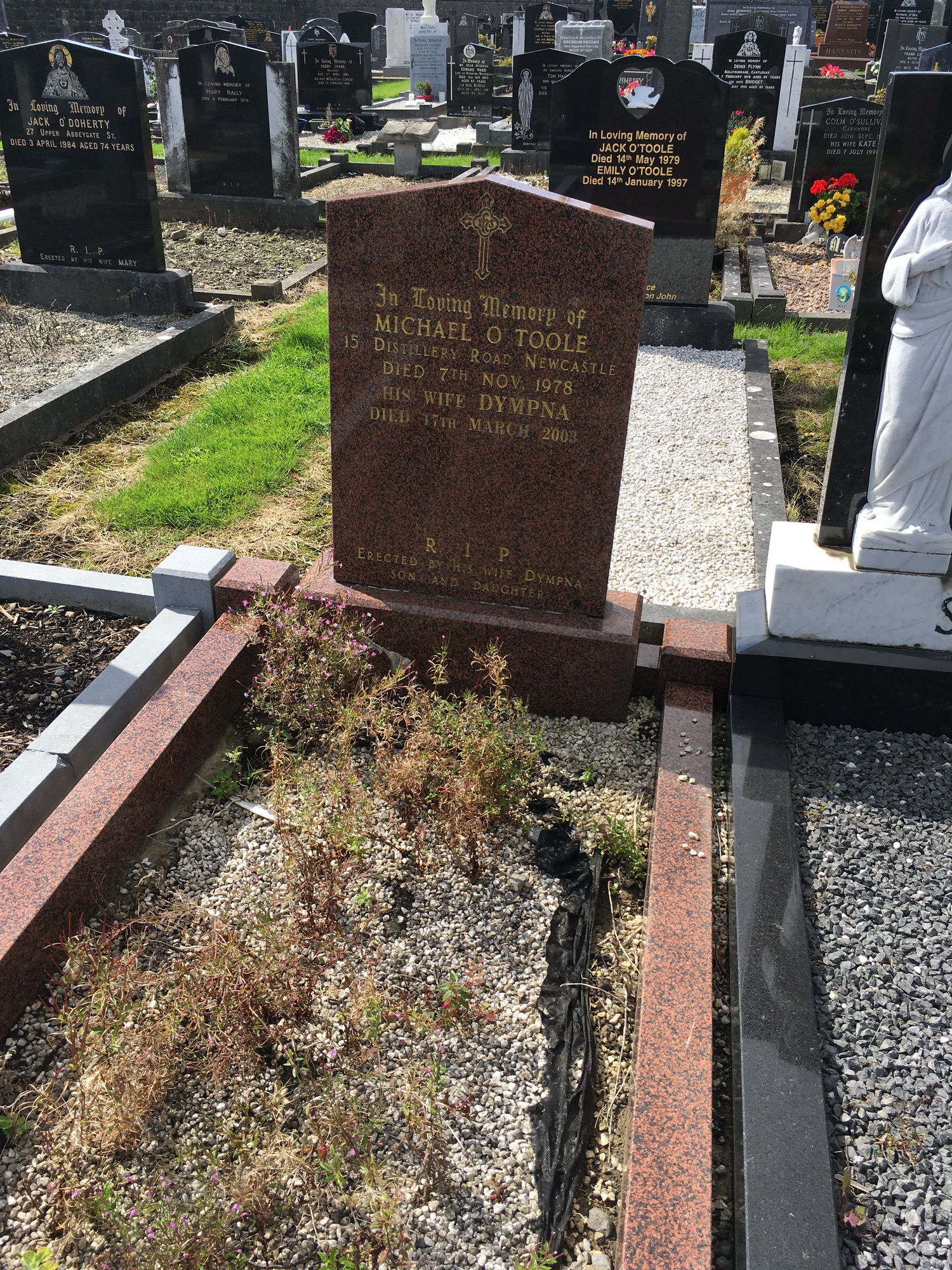 In loving memory of, Michael O'Toole, 15 Distillery Rd Newcastle, died 7 Nov 1978, his wife Dympna, died 17 March 2003.