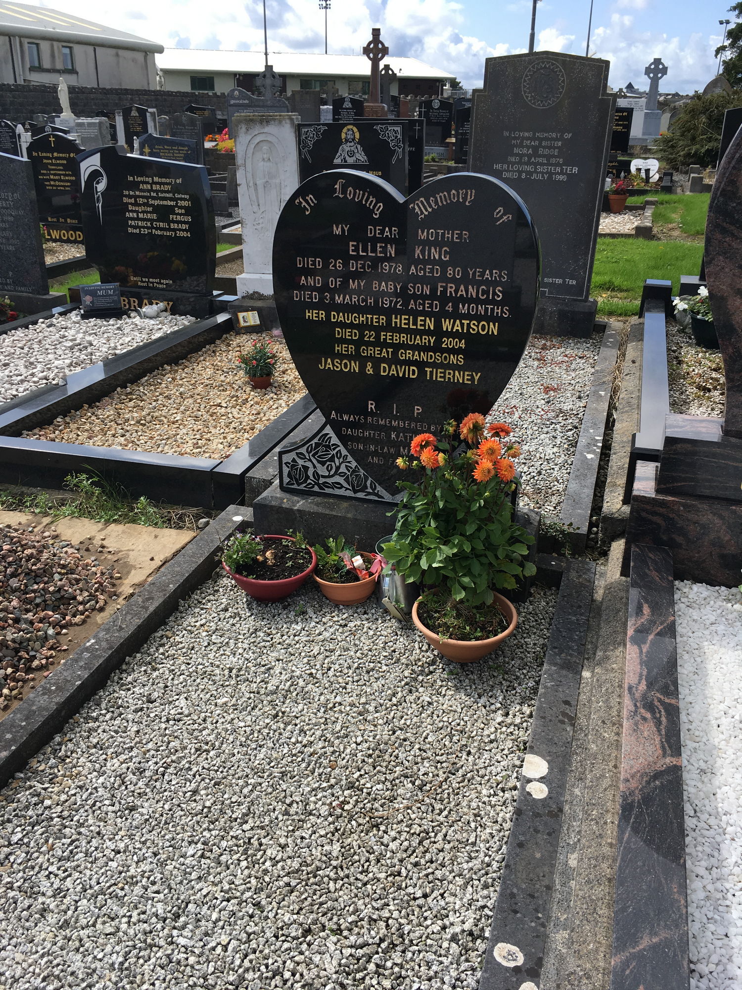 In loving memory of, my dear mother, Ellen King, died 26 Dec 1978, aged 80 years, and of my baby son Francis, died 3 March 1972 aged 4 months, her daughter Helen Watson, died 22 Feb 2004, her great grandsons, Jason and David Tierney.