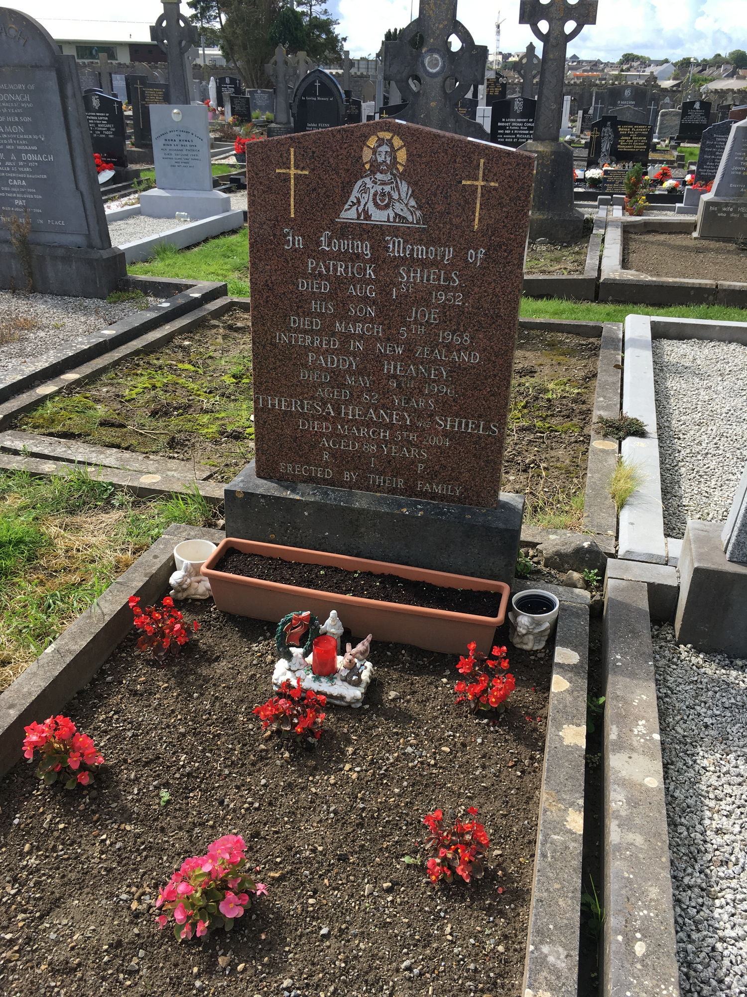 In loving memory of, Patrick Shiels, died Aug 1 1952, his son Joe, died March 5 1968, interred in New Zeeland, Paddy Heaney, died May 9 1996, aged 82 years, Theresa Heaney nee Shiels, died March 5 2004, aged 88 years.