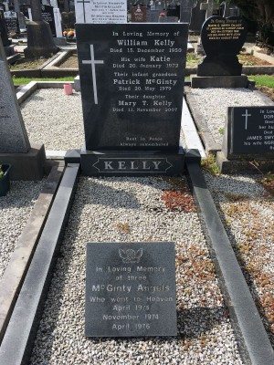 In loving memory of, William Kelly, died 15 Dec 1950, his wife Katie, died 20 jan 1972, their infant grand son, Patrick McGinty, died 20 May 1979, their daughter Mary T Kelly, died 11 Nov 2007. In loving memory of three McGinty angels, who went to Heaven, April 1974, Nov 1974, April 1976.