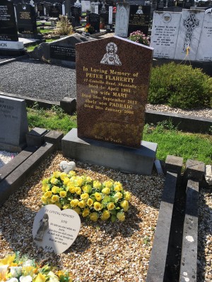 In loving memory of, Peter Flaherty, 1 Costello Road Shantalla, died 1 April 1985, his wife Mary, died 28 Sept 2012, their son Padraig, died 26 Jan 2006.