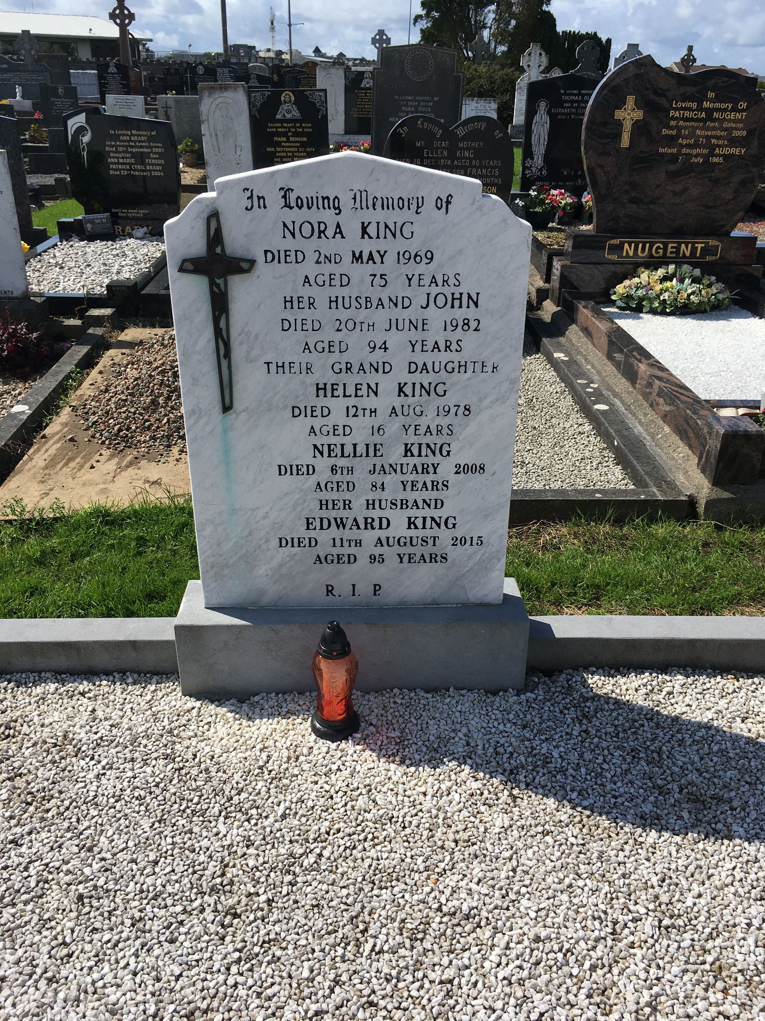 In loving memory of, Nora King, died 2 May 1969, aged 75 years, her husband John, died 20 June 1982, aged 94 years, their grand daughter, Helen King, died 12 Aug 1978, aged 16 years, Nellie King, died 6 Jan 2008, aged 84 years, her husband, Edward King, died 11 Aug 2015 aged 95 years.