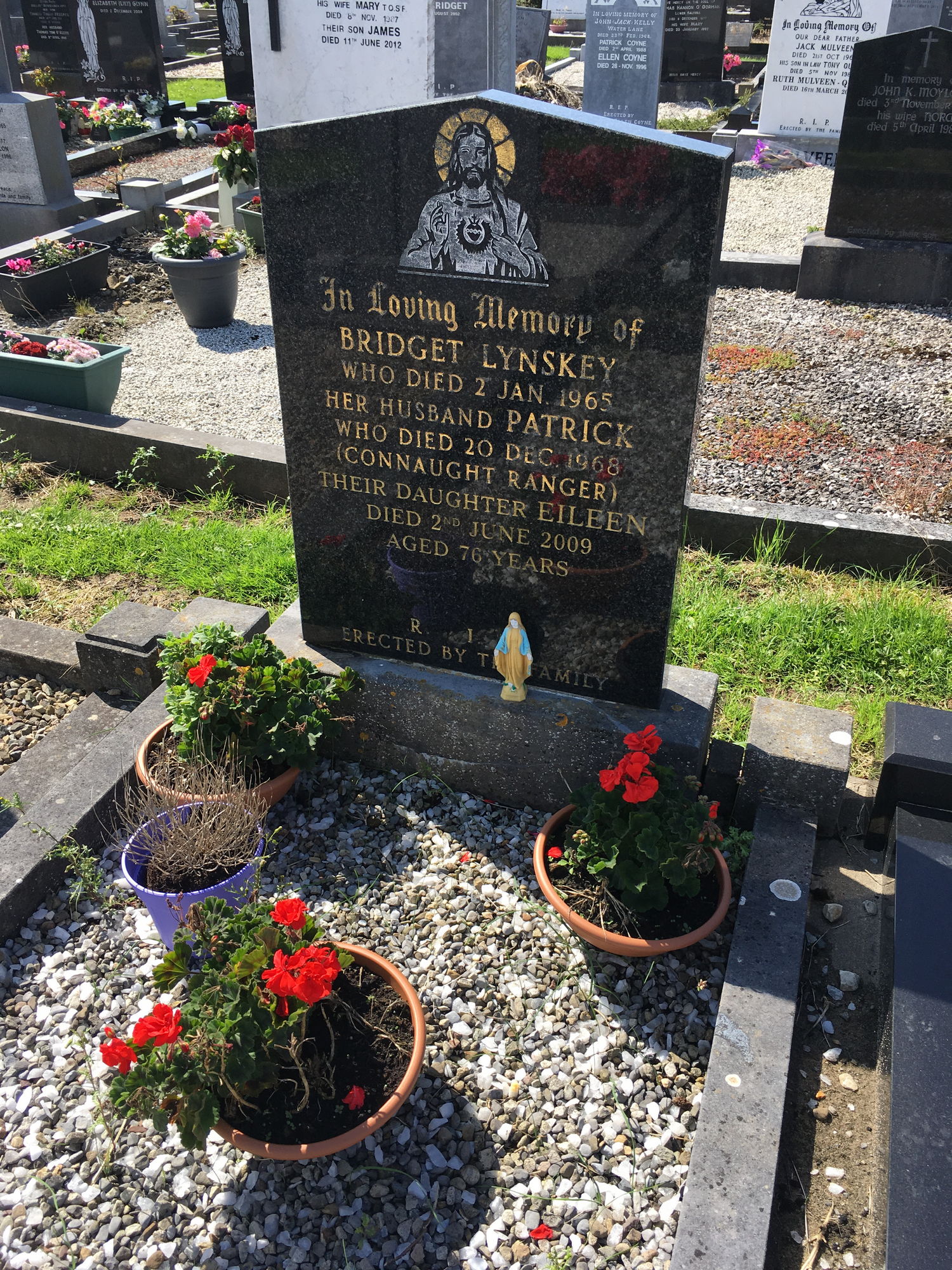 In loving memory of, Bridget Lynskey, who died 2 Jan 1965, her husband Patrick, who died 20 Dec 1968, Connaught Ranger, their daughter Eileen, died 2 June 2009, aged 76 years