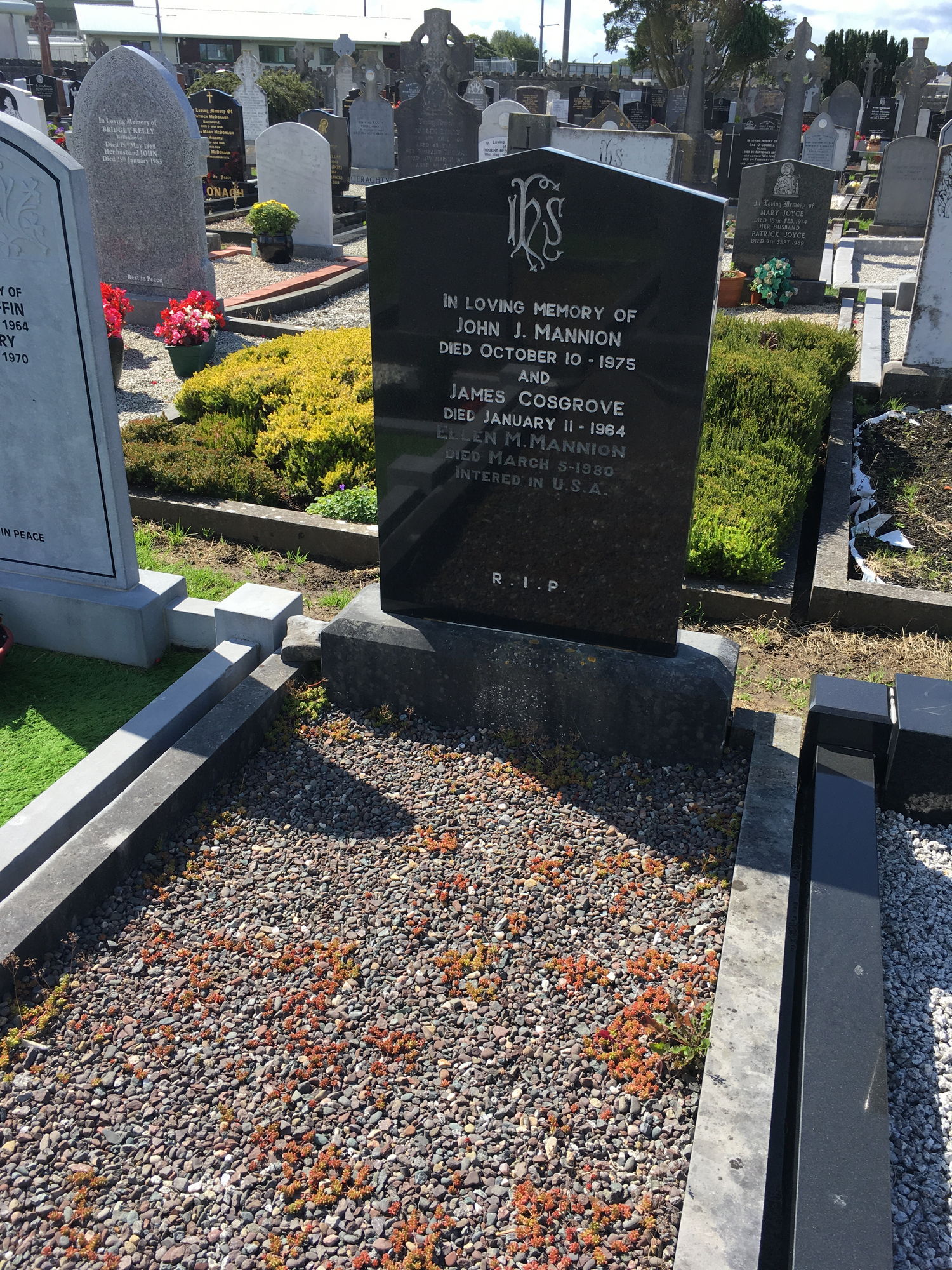 In loving memory of, John J Mannion, died Oct 10 1975, and, James Cosgrove, died Jan 11 1964, Ellen M Mannion, died March 5 1980, interred in the USA.