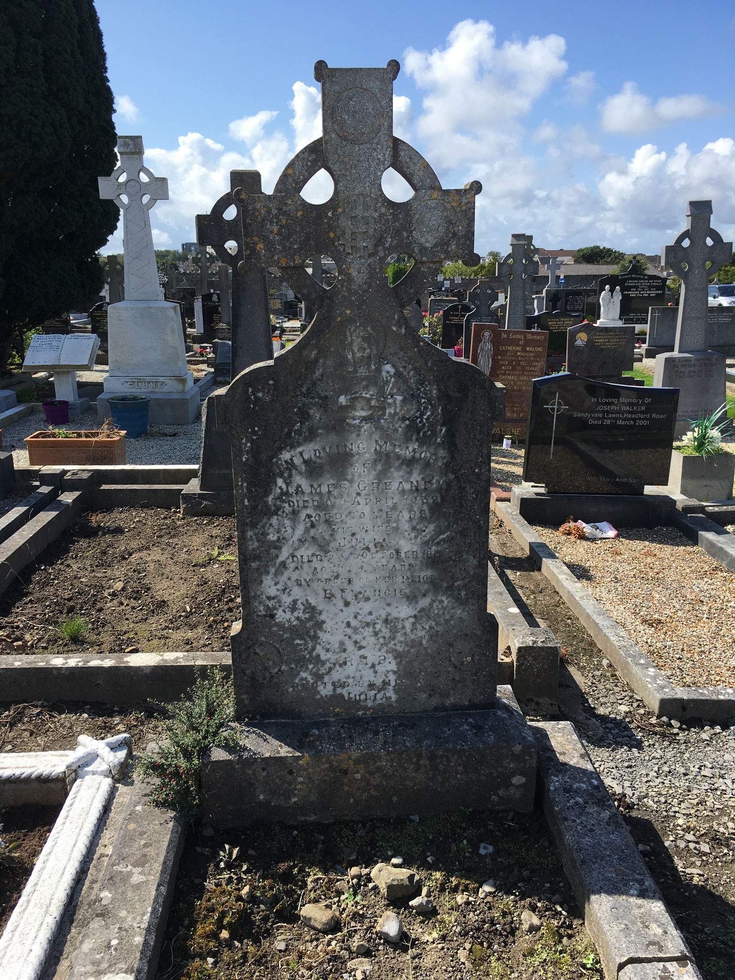 In loving memory of, James Greaney, died April 1938, aged 70 years, his wife, Julia, died 23 Oct 19?? Aged 94 years.