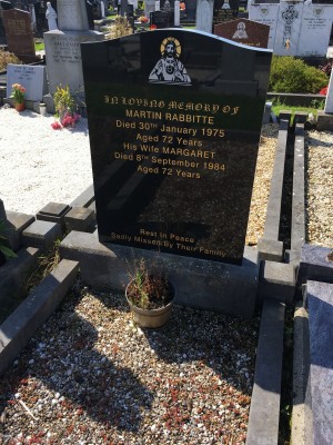 In loving memory of, Martin Rabbitte, died 30 Jan 1975, aged 72, his wife Margaret, died 98 Sept 1984, aged 72 years.