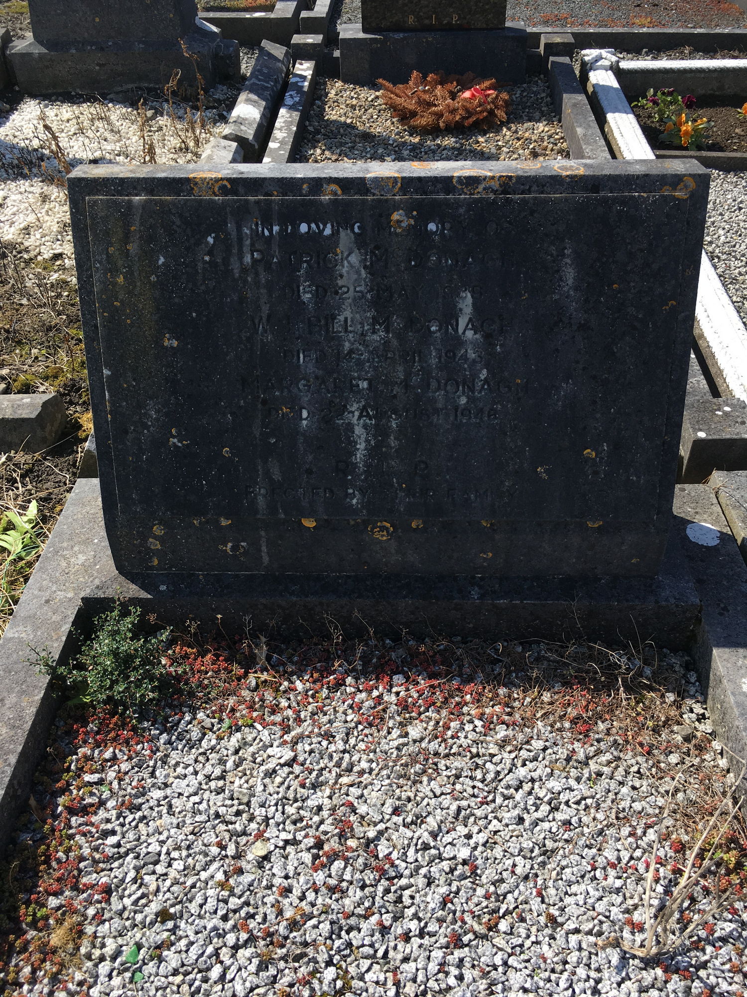In loving memory of, Patrick McDonagh, died 25 May 1939, Bill McDonagh died 14 April 1943, Margaret McDonagh died 22 Aug 1946.