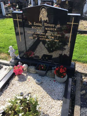 In loving memory of, Michael Madden, McBride Ave, died 21 June 1982 aged 21 years, his father Tim, died 6 Sept 1984.