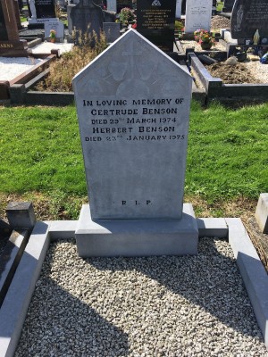 In loving memory of, Gertrude Benson, died 29 March 1974, Herbert Benson, died 22 Jan 1975.