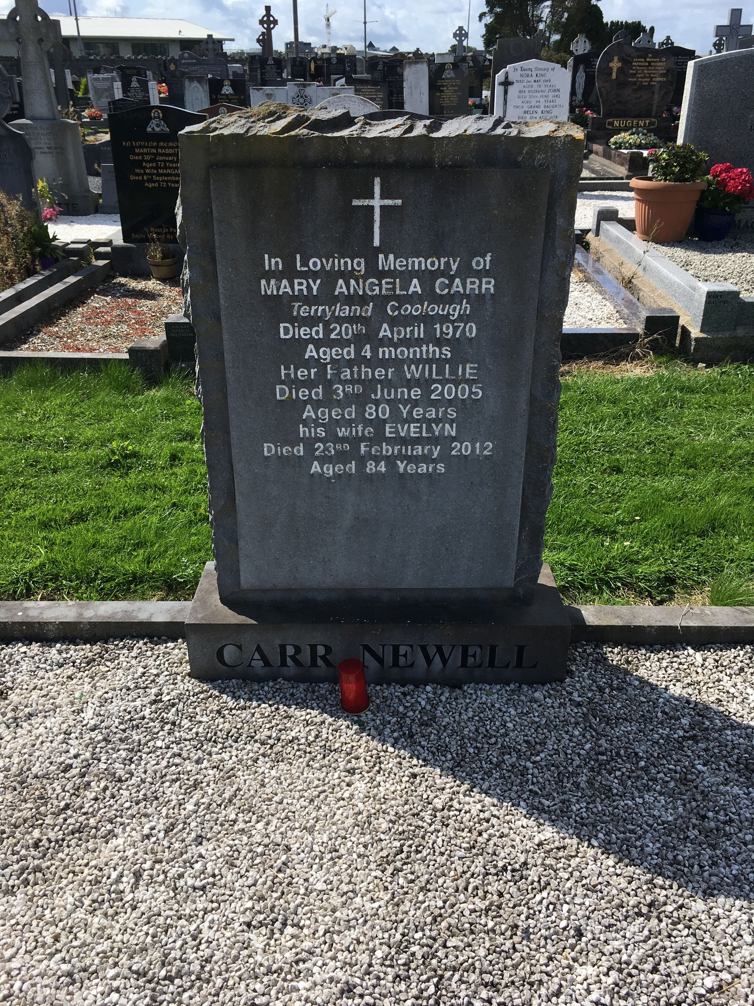 In loving memory of, Mary Angela Carr, Terryland Coolough, died 20 April 1970, aged 4 months, her father Willie, died 3 June 2005, aged 80 years, his wife Evelyn, died 23 Feb 2012, aged 84 years.
