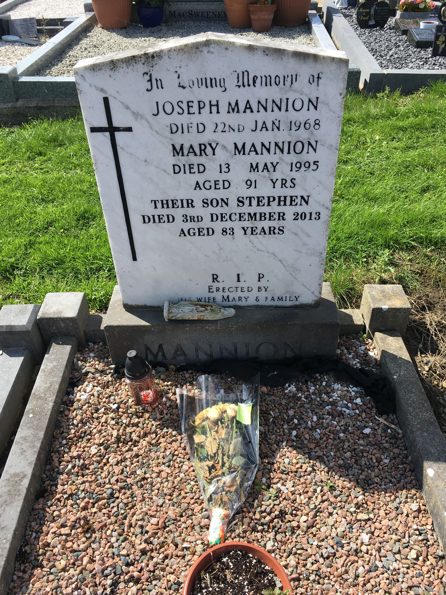 In loving memory of, Joseph Mannion, died 22 Jan 1968, Mary Mannion, died 13 May 1995, aged 91 years, their son Stephen, died 3 Dec 2013, aged 83 years.