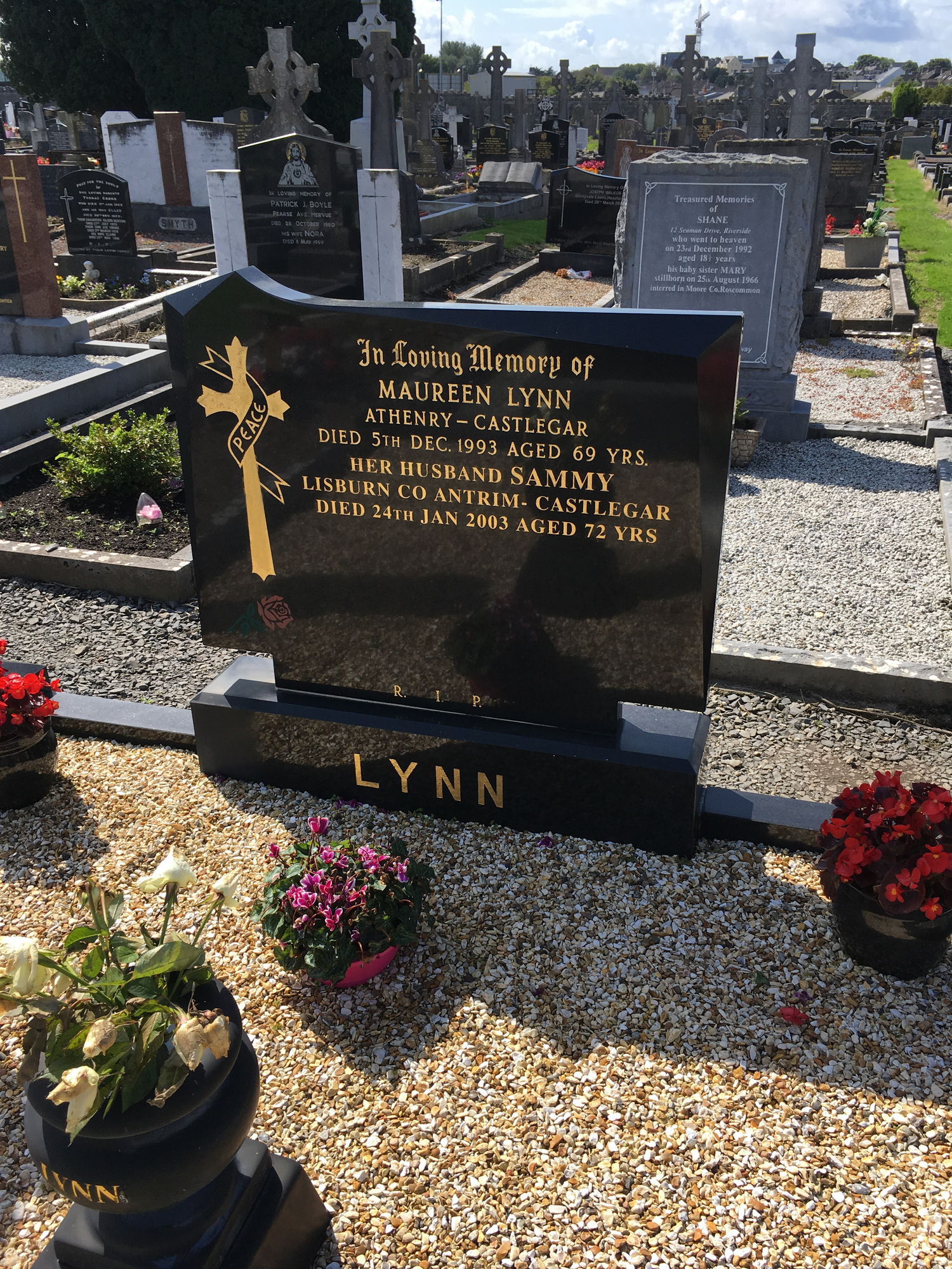 In loving memory of, Maura Lynn, Athenry-Castlegar, died 5 Dec 1993 aged 69 years, her husband Sammy, Lisburn Co Antrim-Castlegar, died 24 Jan 2003 aged 72 years.