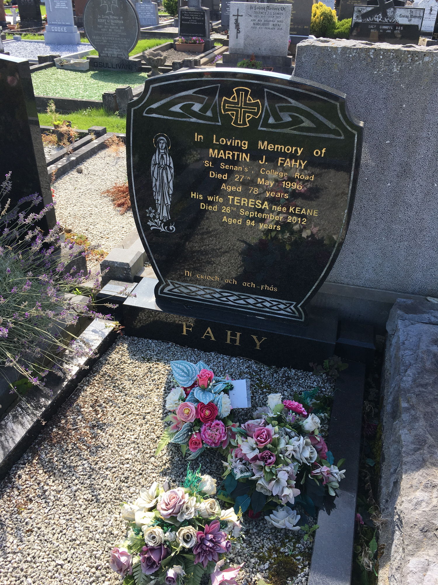 In loving memory of, Martin J Fahy, St Senan's College Road, died 27 May 1996, aged 78 years, his wife Teresa nee Keane, died 26 Sept 2012, aged 94 years.