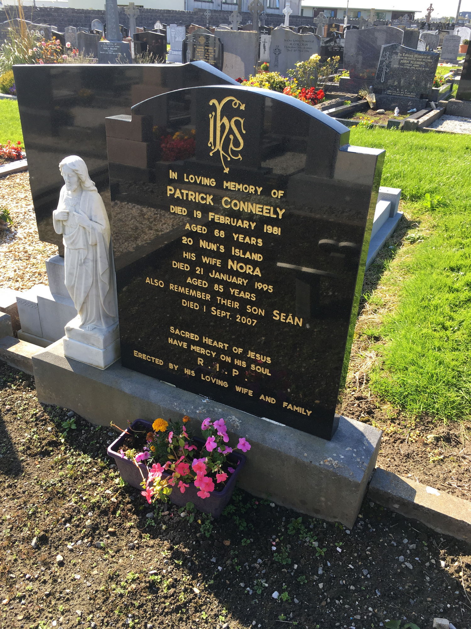 In loving memory of, Patrick Conneely, died 19 Feb 1981, aged 68 years, 20 Nuns Island, his wife Nora, died 21 Jan1995, aged 85 years, also remembered their son Sean, died 1 Sept 2007.