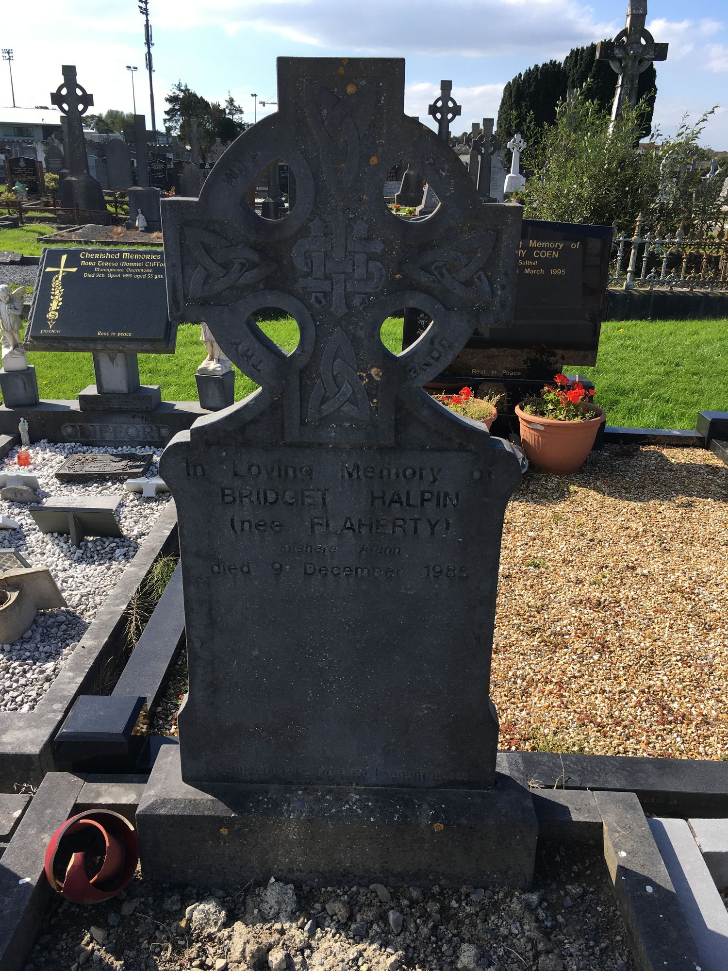 In loving memory of, Bridget Halpin, nee Flaherty, Inishere Arann, died 9 Dec 1985.