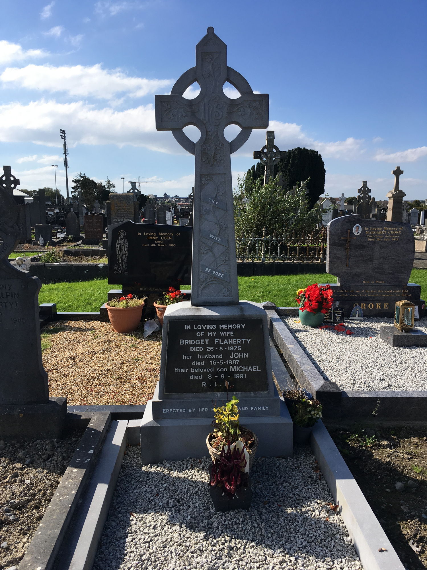 In loving memory of my wife, Bridget Flaherty, died 26-8-1975, her husband John, died 16-5-1987, their beloved son Michael, died 8-9-1991.