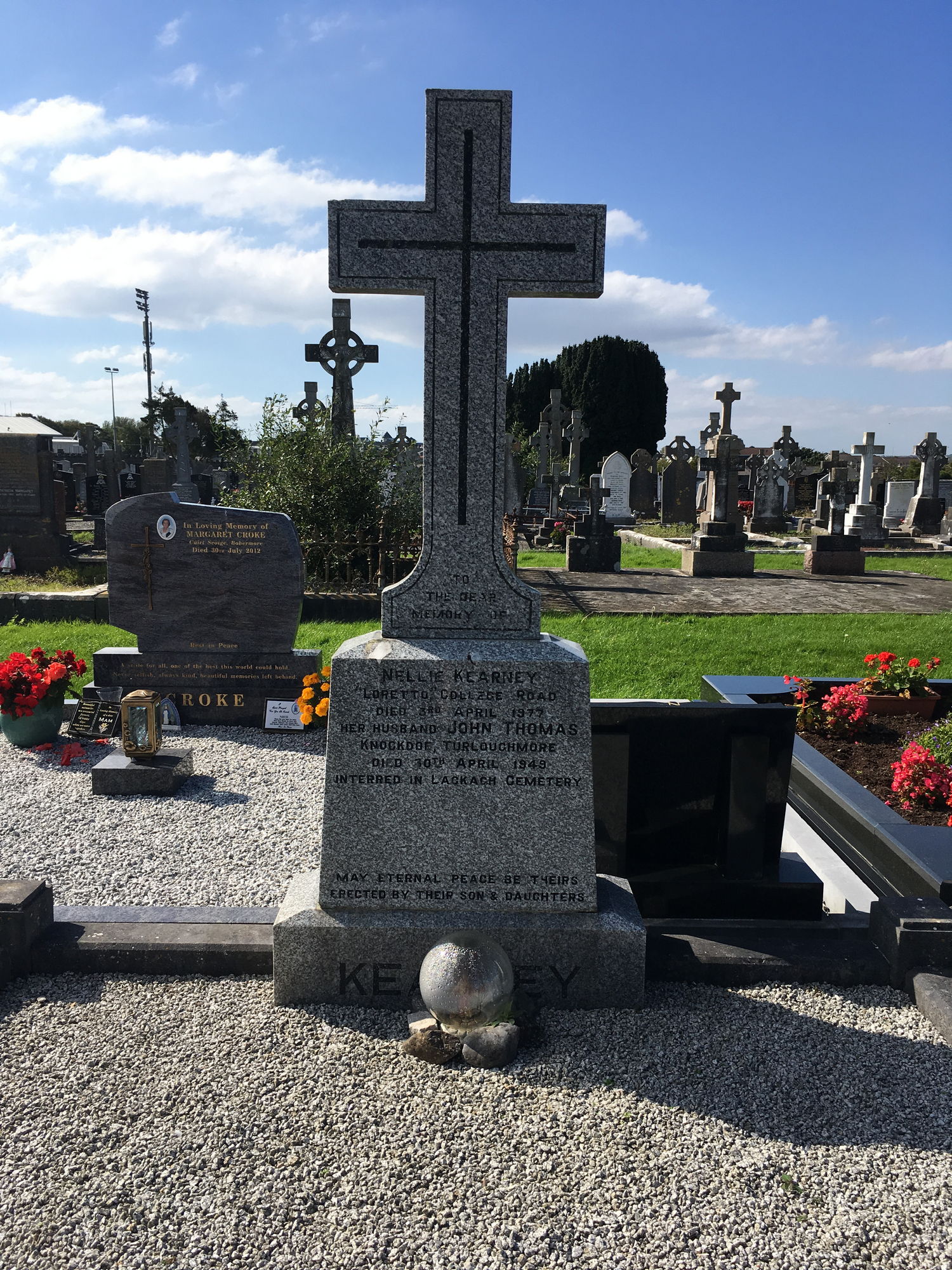 To the dear memory of, Nellie Kearney, Loretto College Road, died 3 April 1977, her husband John Thomas, Knockdoe Turloughmore, died 30 April 1949, interred in Lackagh Cemetery.