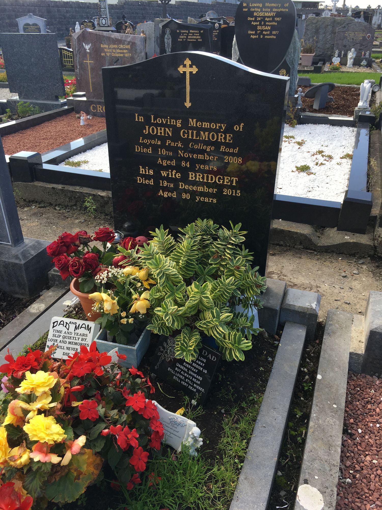 In loving memory of, John Gilmore, Loyola Park College Road, died 10 Nov 2008, his wife Bridget, died 19 Dec 2015, aged 90 years.
