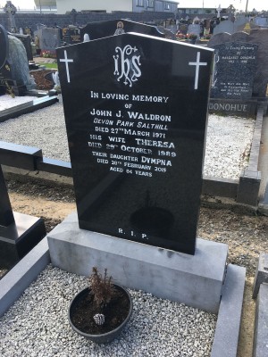 In loving memory of, John J Waldron, Devon Park Salthill, died 27 March 1971, his wife Theresa, died 29 Oct 1989, their daughter Dympha, died 28 Feb 2015, aged 84 years.