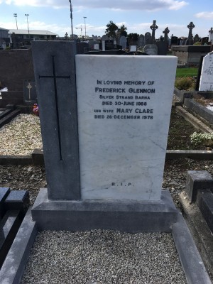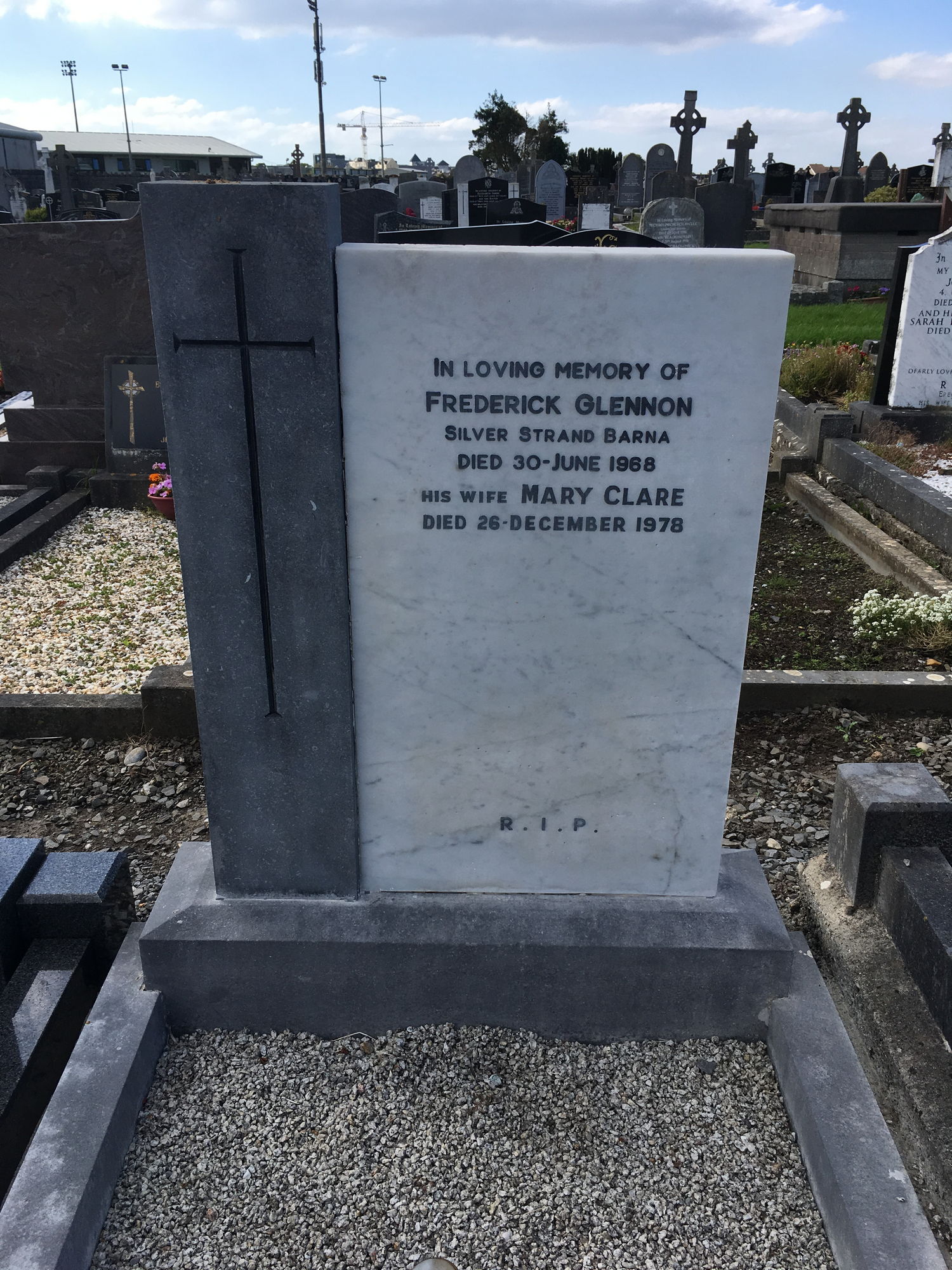 In loving memory of, Frederick Glennon, Silver Strand Barna, died 30 June 1968, his wife Mary Clare, died 26 Dec 1978.