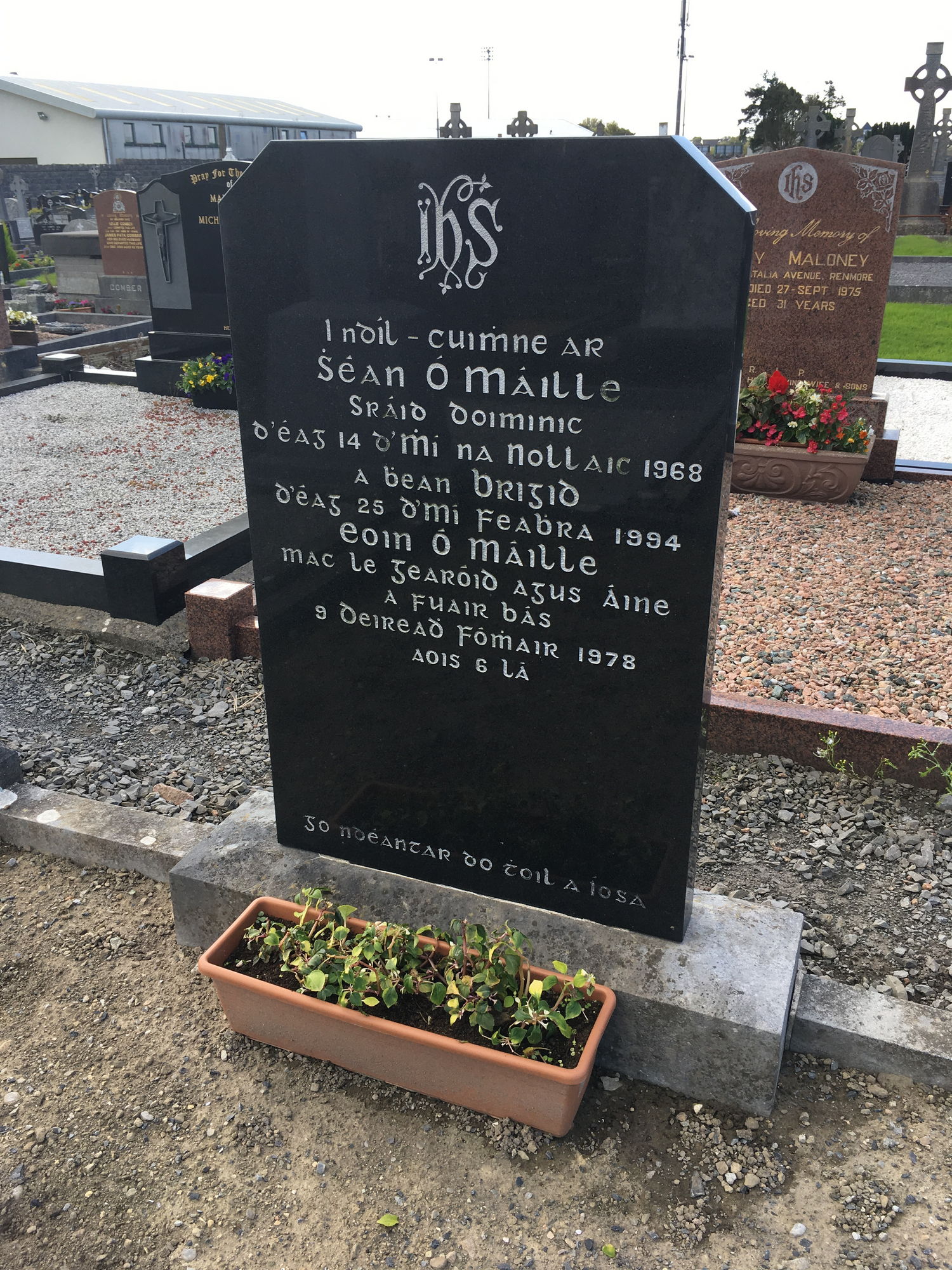 I ndíl-chuimne arShéan Ó MáilleSráid DoiminicD'éag 14 d'Mhí na Nollaig 1968A bhean BrigidD'éag 25 d'mhí Feabhra 1994Eoin Ó Máillemac le Gearóid agus Áinea fuair bás9 Deireadh Fómhair 1978, aois 6 lá.