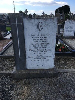 In loving memory of, William Cahill, died 20 July 1967, aged 73 yrs, his wife Ann Mary, died 18 Feb 1977, aged 76 yrs, William Ambroise Cahill, died 1 April 1992, aged 59 yrs, his wife, Teresa Sophie Isabel nee Quinn, Claudy Co Derry, 18-5-1936 - 9-7-2009.