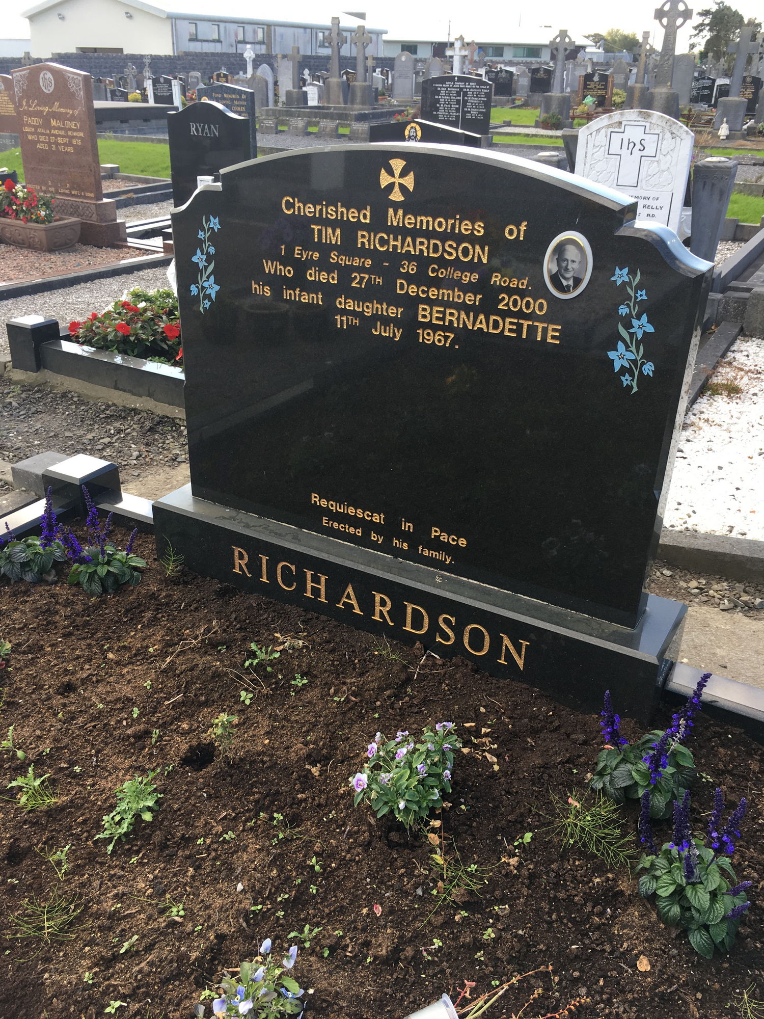 Cherished memories of, Tim Richardson, 1 Eyre Sq - 36 College Rd, who died 27 Dec 2000, his infant daughter Bernadette, 11 July 1967.