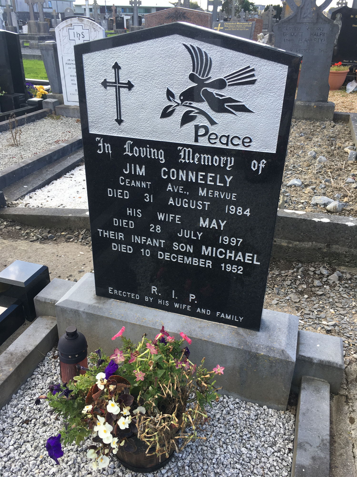 In loving memory of, Jim Conneely, Ceant Ave Mervue, died 31 Aug 1984, his wife Mary, died 28 July 1997, their infant son Michael, died 10 Dec 1952.