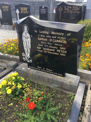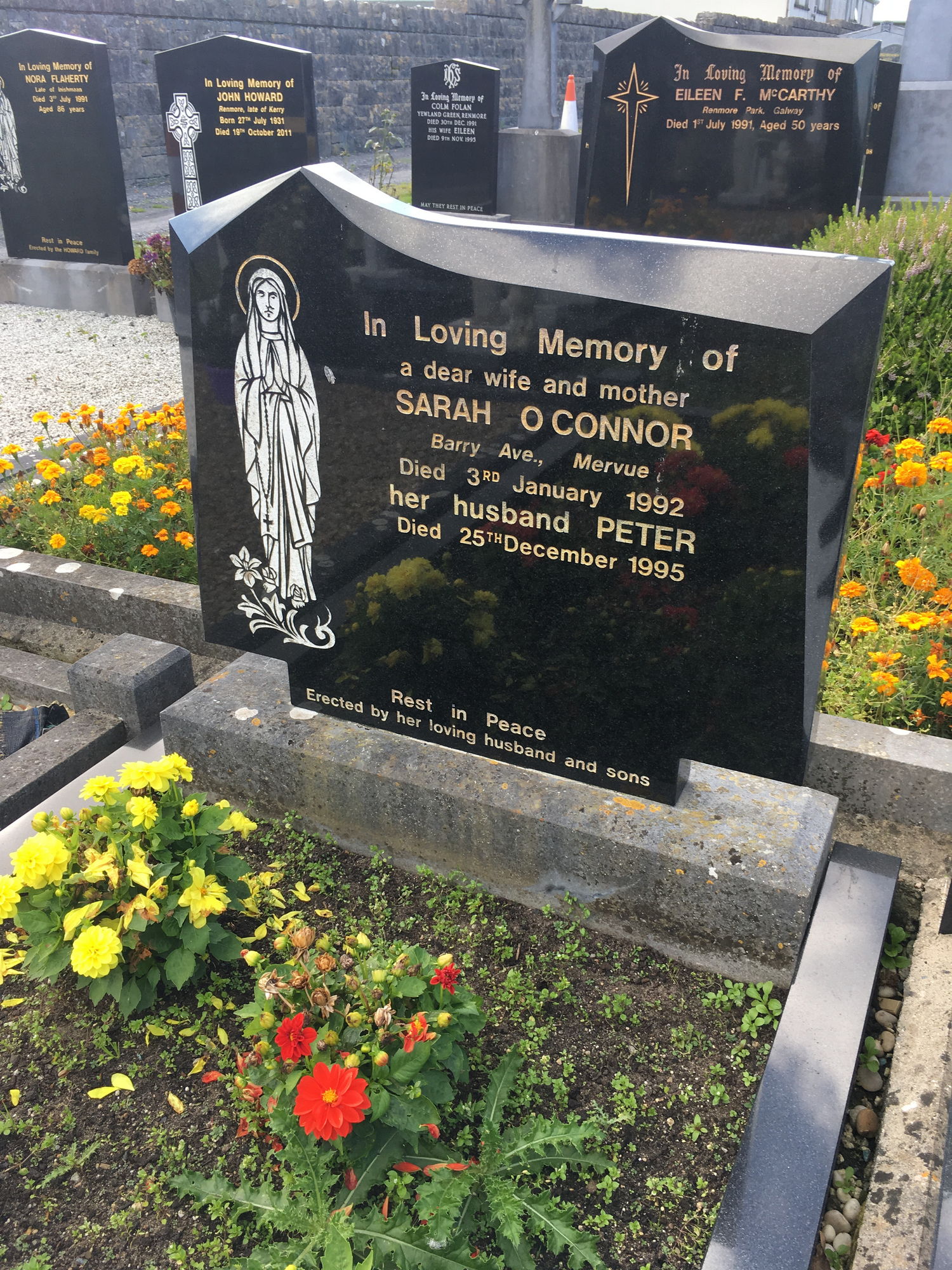 In loving memory of a dear wife and mother, Sarah O'Connor, Barry Ave Mervue, 3 Jan 1992, her husband Peter, died died 25 Dec 1995.