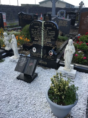 In loving memory of, Mary Linda Ward, 307 Corrib Park, died 10 May 19 aged 4 years, her brother Michael Gerard, died19 aged1 year, their brother Jamie Ward, died 22 Dec 2002, and their little nephew baby William Ward, died 2009.
