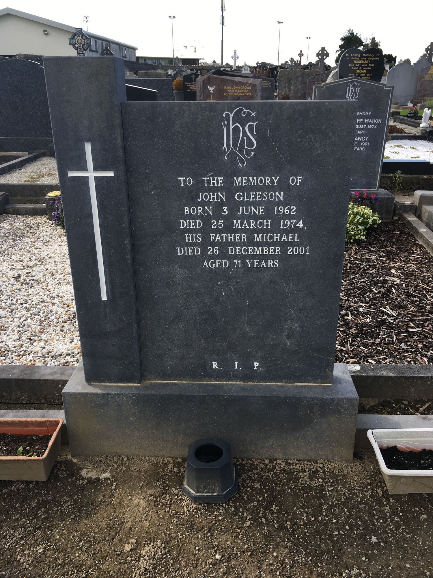 To the memory of, John Gleeson, born 3 June 1962, died 25 March 1974, his father Michael, died 26 Dec 2001, aged 71 years.