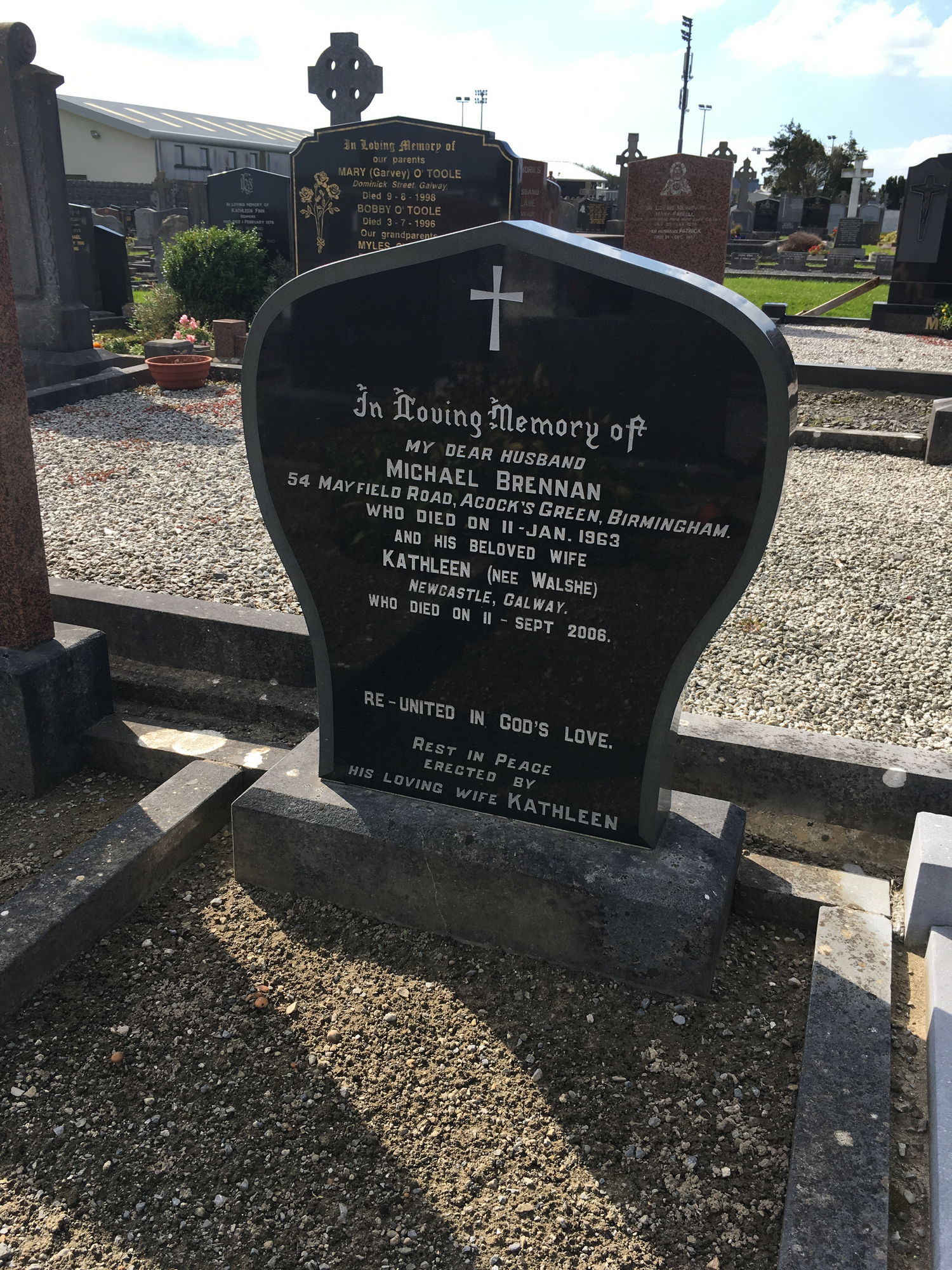 In loving memory of my dear husband, Michael Brennan, 54 Mayfield rd Acocks Green Birmingham, who died on 11 Jan 1963, and his beloved wife, Kathleen nee Walshe, Newcastle Galway, who died 11 Sept 2006.