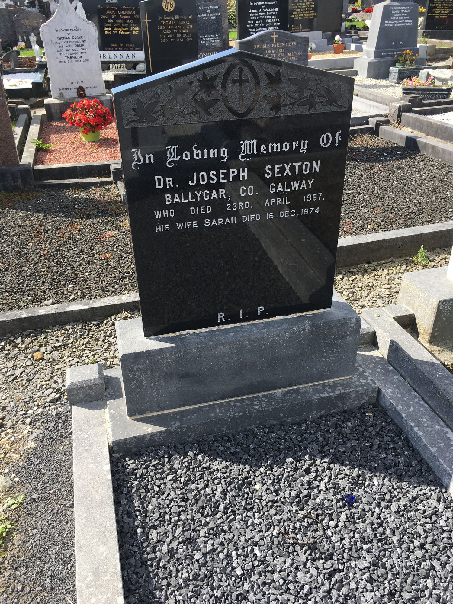 In loving memory of, Dr Joseph Sexton, Ballygar Co Galway, who died 23 April 1967, his wife Sarah died 16 Dec 1974.