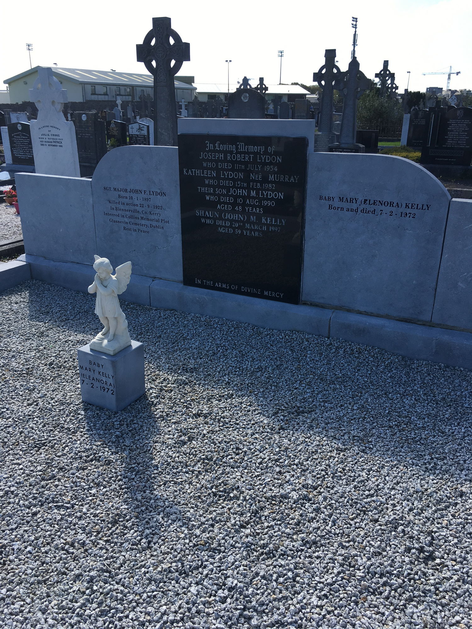 In loving memory of, Joseph Robert Lydon, who died 11 July 1954, Kathleen Lydon nee Murray, died 15 Feb 1982, their son John M Lydon, died 10 Aug 1990, Shaun M Kelly died 20 March 1997, agrd 59 yrs. Sgt Major F Lydon, born 10-1-1897, killed in action 22-9-1922, in Blennerville Co Kerry, Interred in Collins Memorial Plot Glasnevin Cemetery Dublin. Baby Mary Elenora Kelly, born and died 7-2-1972.