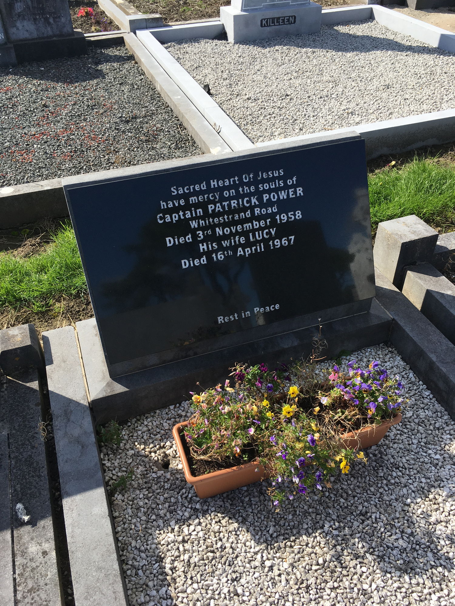 Sacred heart of Jesus, have mercy on the soul of, Captain Patrick Power, Whitestand Road, died 3 Nov 1958, his wife Lucy, died 16 April 1967.