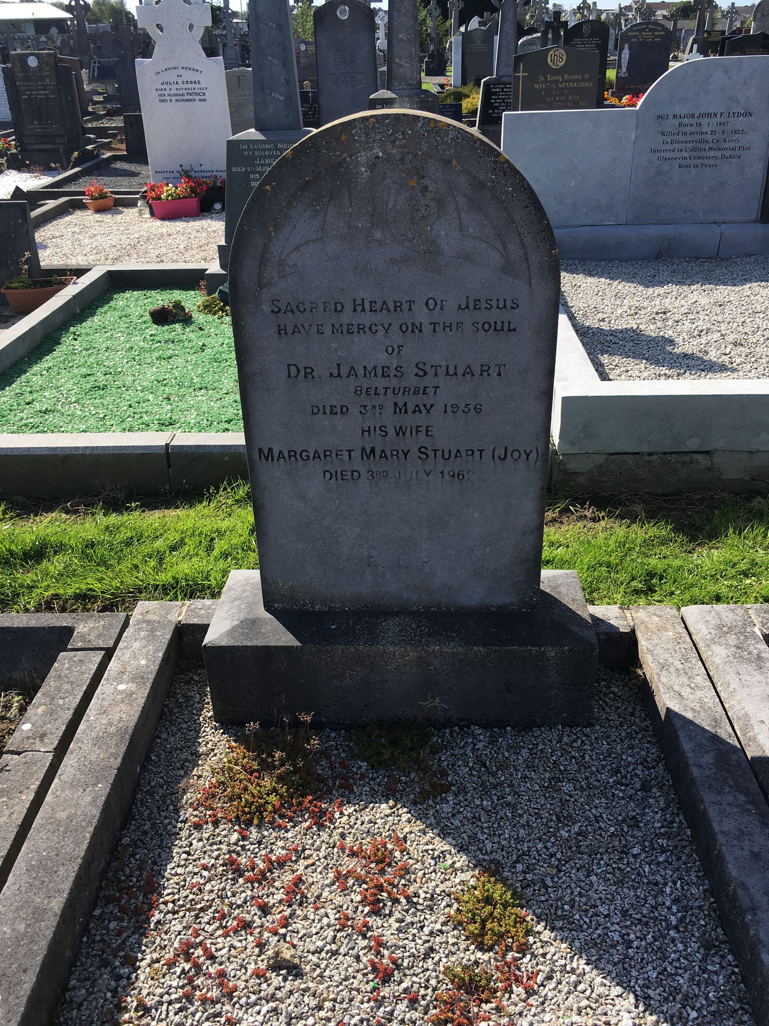 Sacred heart of Jesus have mercy on the soul of, Dr James Stuart, Belturbet, died 3 may 1956, his wife Margaret Mary Stuart (Joy), died 3 July 1962.