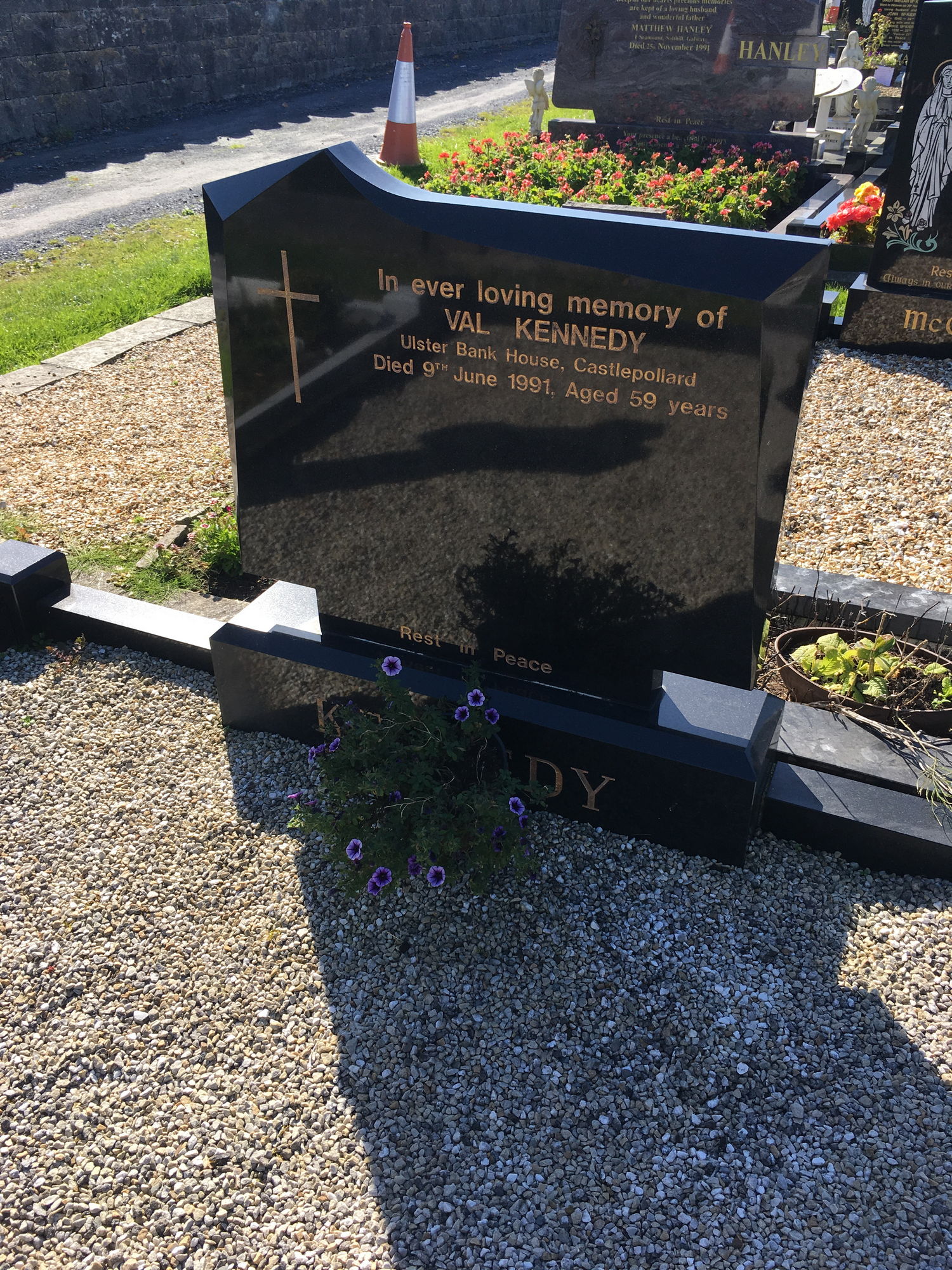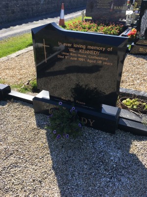 In ever loving memory of, Val Kennedy, Ulster Bank House Castlepollard, died 9 June 1991, aged 50 yrs.