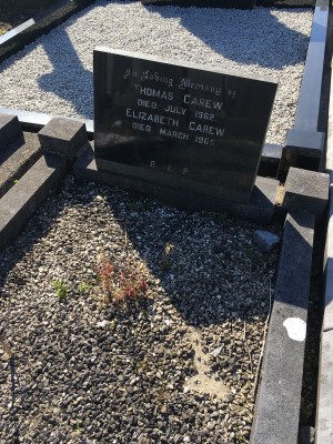 In loving memory of, Thomas Carew died July 1962, Elizabeth Carew died March 1965.