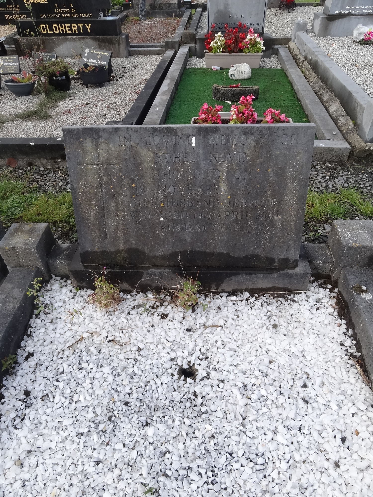 In loving memory ofEthel Nevinwho died on19 November 19?4Her husband Dermotwho died 14 April 2001aged 84 years