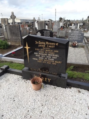 In Loving Memory ofANNIE CAREYSalthillDIED 25TH MARCH 1988HER HUSBAND MICHAELDIED 30TH JUNE 2007AGED 78 YEARSTHEIR BABY DAUGHTER MARYDIED 13TH MAY 1959