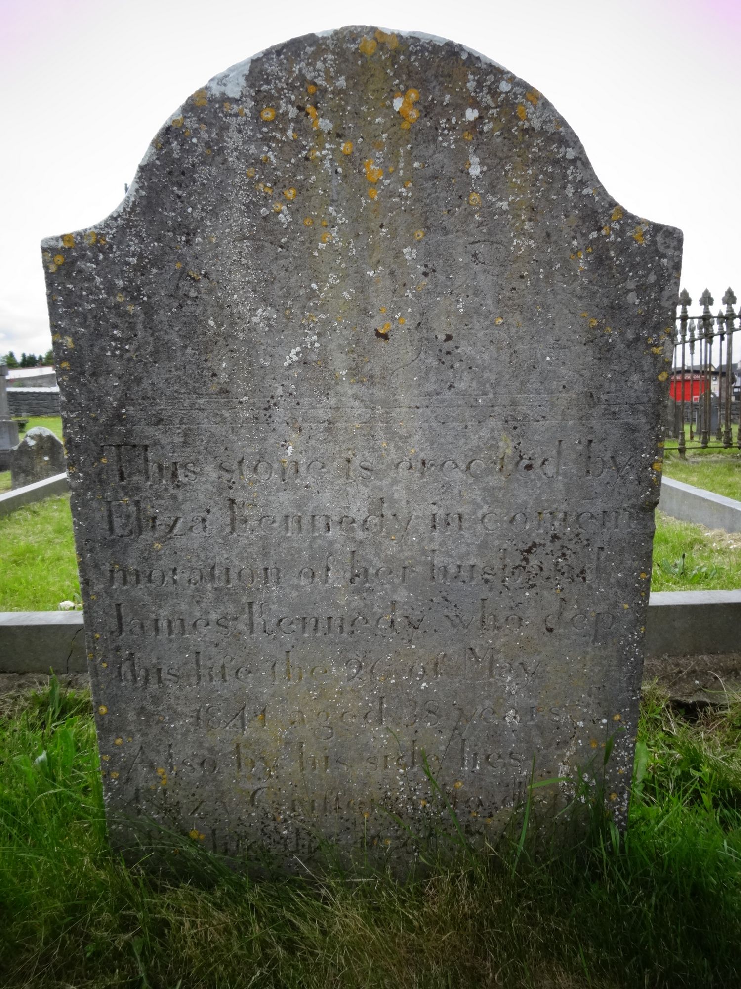 This stone is erected byEliza Kennedy in comemmoration of her husbandJames Kennedy who depthis life the 26 of May 1841 aged 38 yearsAlso by his side lies Eliza Griffen who dep this life the 16 of March 1842 aged 3 years