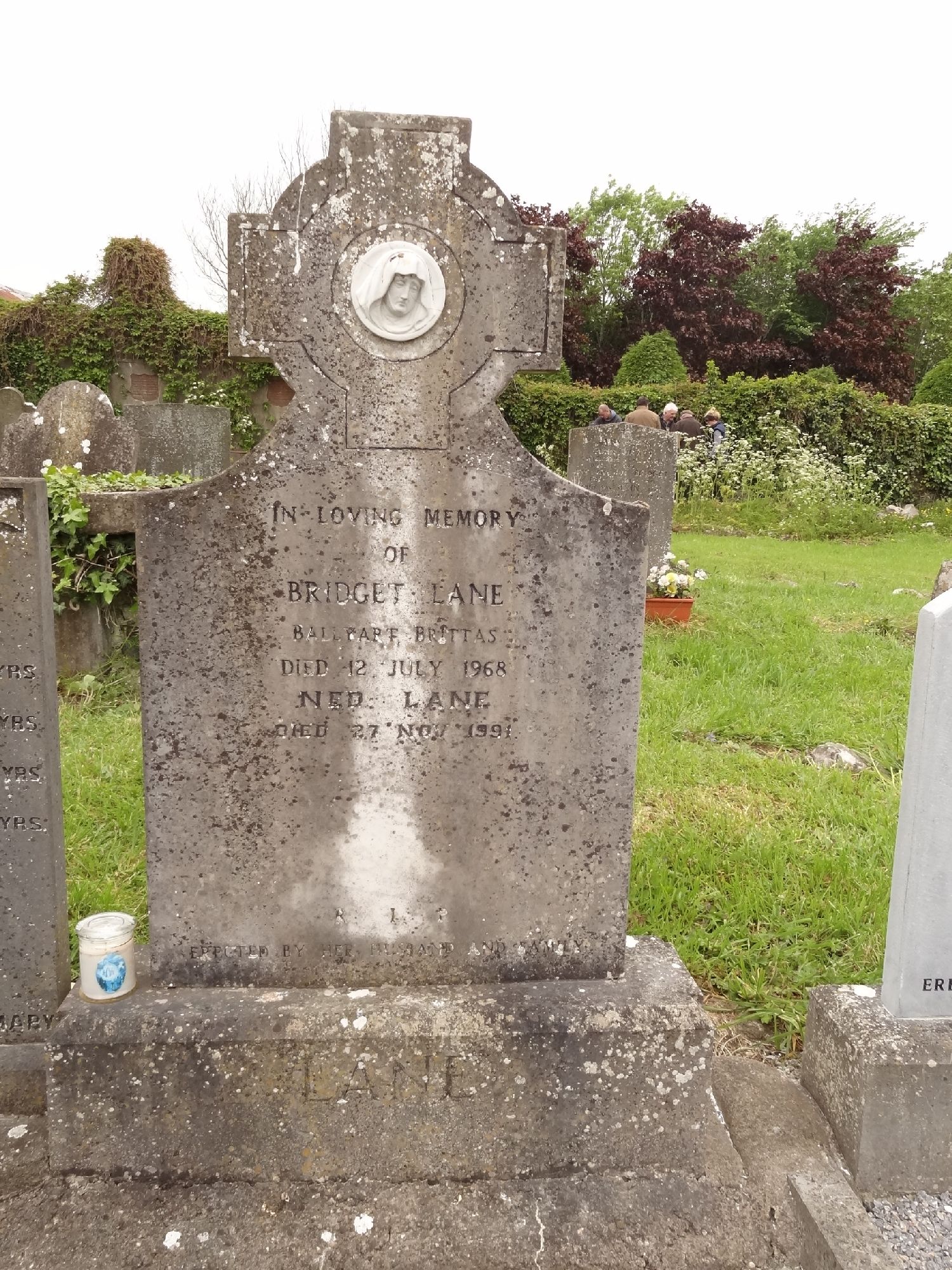 In loving memory of Bridget Lane Ballpark Brittas Died 12 July 1968 Ned Lane Died 27 Nov 1991 RIP Erected by her husband and family