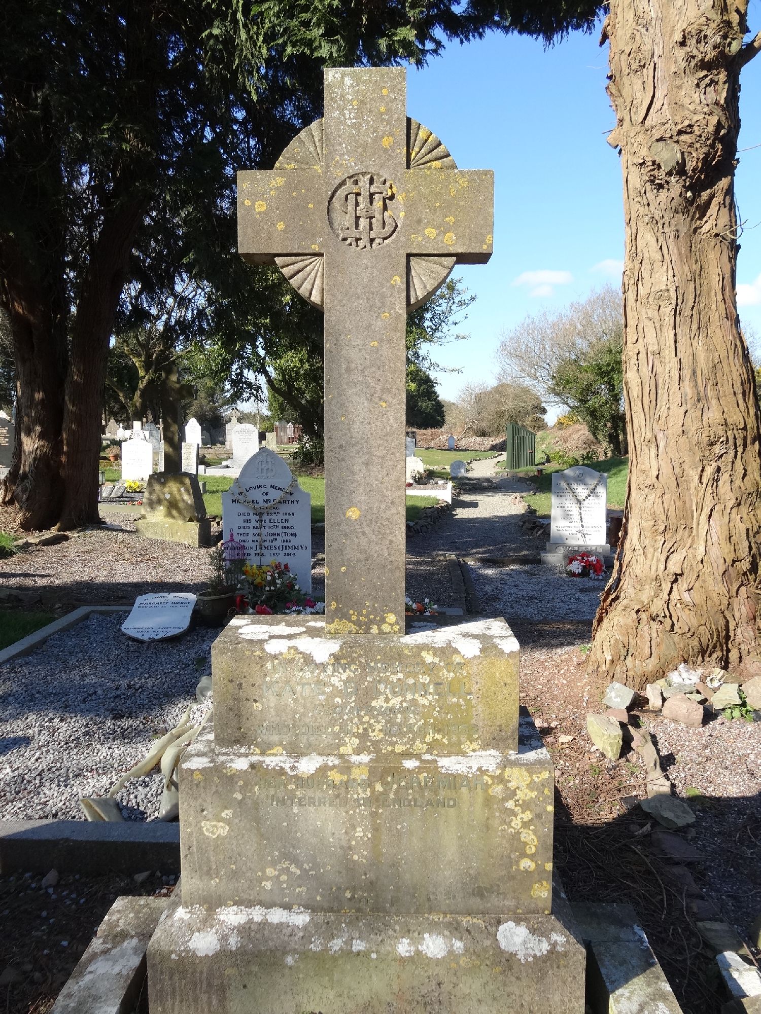 I. H. S. IN LOVING MEMORY OF KATE O'CONNELL WHO DIED 11th MARCH 1952 HER HUSBAND JEREMIAH INTERRED IN ENGLAND