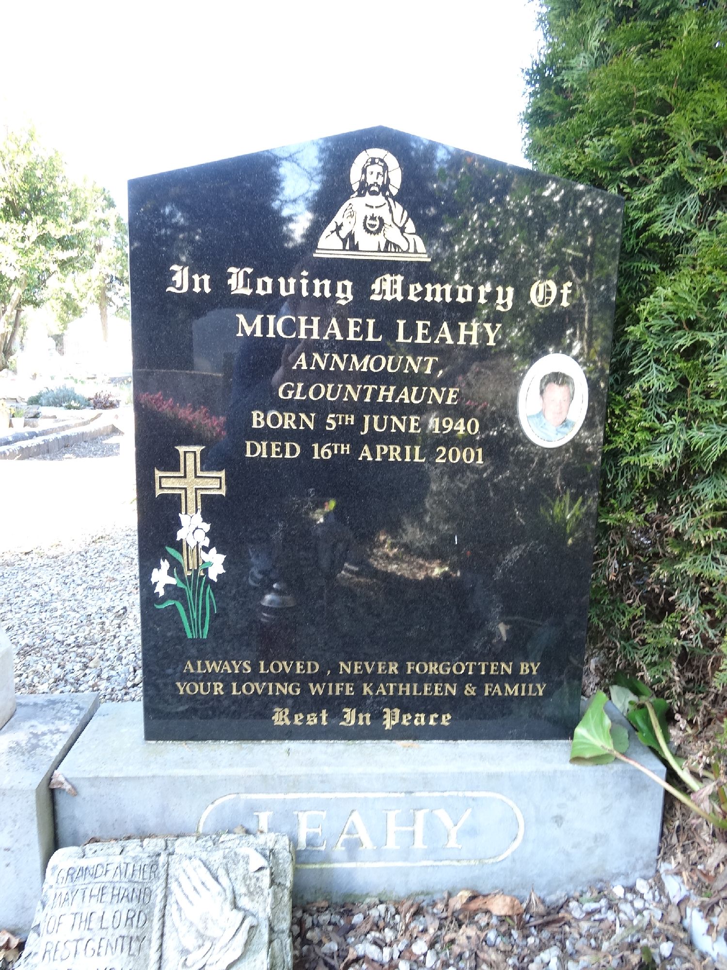 IN LOVING MEMORY OF MICHAEL LEAHY ANNMOUNT, GLOUNTHAUNE. BORN 5th JUNE 1940 DIED 16th APRIL 2001 ALWAYS LOVED,NEVER FORGOTTEN BY YOUR LOVING WIFE KATHLEEN & FAMILY REST IN PEACE LEAHY