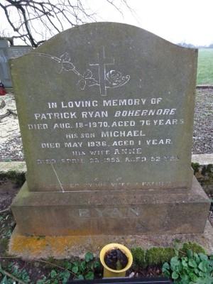 In Loving Memory of Patrick Ryan Bohernore died Aug. 18, 1970, aged 76 years. His son Michael died May 1936 aged 1 year. His wife Anne died April, 23, 1993 aged 92 yrs. Erected by his wife and family.